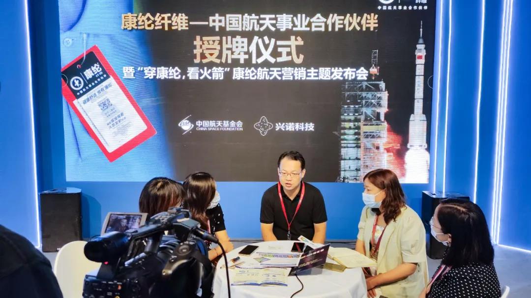在媒體訪談環節,興諾康綸董事長趙丹青向記者介紹了康綸航天®纖維多個系列產品的優勢亮點、應用領域和發展前景,以及未來產業鏈上下游合作推廣方向。他指出“康綸航天®纖維主打健康、環保系列產品,可廣泛用于貼身衣物、運動、航天、非織造布等領域,目前已經陸續被安踏,愛慕,太平鳥、七匹狼、特步、小米等行業頭部品牌采用或意向簽約,并打造了綠盾口罩、康綸航天內褲等多個自主品牌產品。