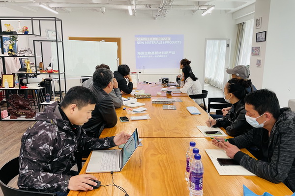 接著源海新科王總介紹了海藻纖維的發展歷程,作為海藻纖維的主要投資方,王總也看好海藻纖維的發展前景,并積極投入海藻纖維的推廣應用中來。海藻纖維下游產品開發代表單位山東奈琦爾海洋科技有限公司設計總監姜雅慧介紹海藻纖維的應用。座談期間莫特斯總工程師青島資深染整專家苗永軍對海藻纖維的產品性能與來訪的源海新科一行人進行了探討!
