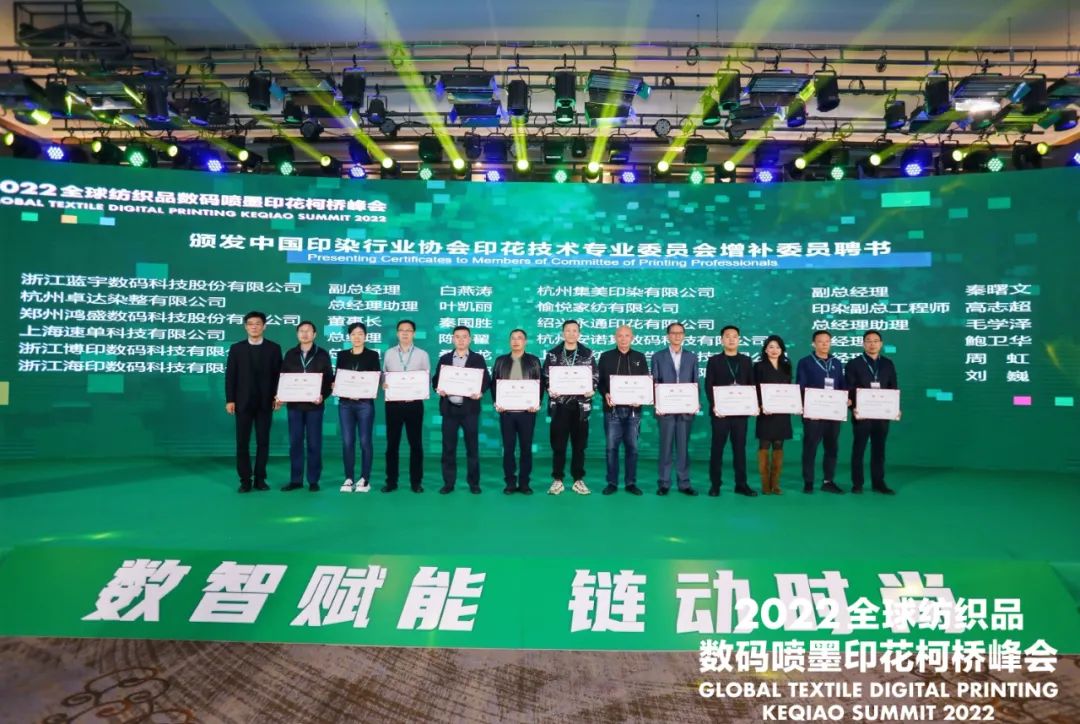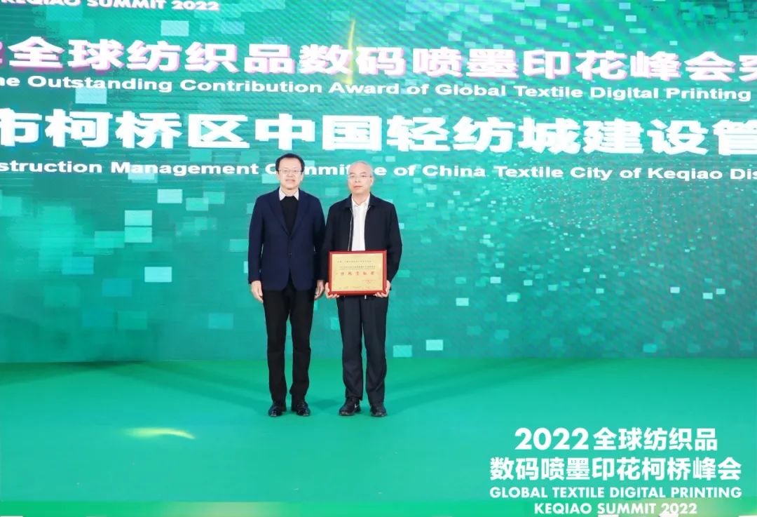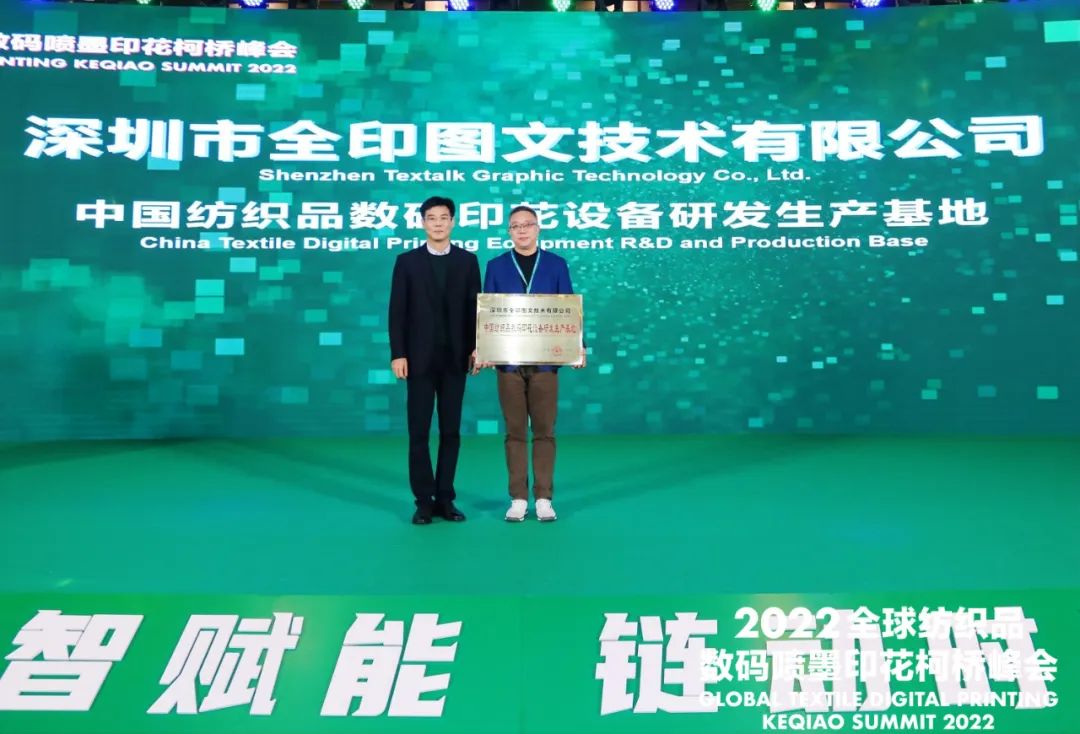 會上,組委會授予中國輕紡城建設管理委員會“2022全球紡織品數碼噴墨印花峰會突出貢獻獎”。為深圳市全印圖文技術有限公司頒發了“中國紡織品數碼印花設備研發生產基地”銅牌。同時還為第四屆中國印染行業協會印花技術專業委員會增補委員頒發了聘書。