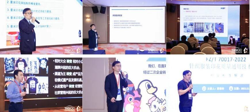 在紡織服裝印花科技發展會議上,與會企業代表紛紛獻計獻策。田菱精密網版科技(昆山)有限公司精密制版事業部部長秦頎新分享了激光快速制作高精細印花網版的要求和性能優勢;杭州景華紡織科技有限公司總經理梁樹奇闡述了滌綸面料免洗數碼直噴工藝以及在服裝及運動面料上的應用前景;沈陽飛行船數碼噴印設備有限公司紡織事業部總經理陳艷艷就精準高效的雙面同步數碼噴墨印花技術及市場進行了分析;廣州三義文訊科技有限公司總經理李巖就企業如何應對T恤印花“一件起訂”柔性生產新趨勢提出了新解決方案;紅紡文化有限公司IP授權中心創新事業部總經理王海濱就IP服裝印花的潮流趨勢進行了展望;中山市紡織工程學會會長黃明華詳細解讀了行業標準《針織服裝印花質量通用技術要求(FZ/T 70017-2022)》。