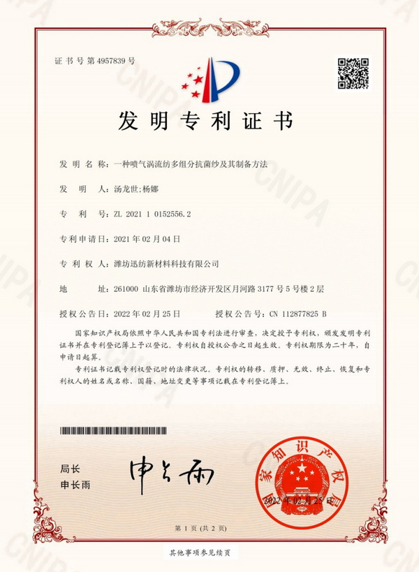 近日,由AgileTex迅紡研發團隊完成的“一種噴氣渦流紡多組分抗菌紗及其制備方法”技術成果,喜獲國家發明專利授權。該發明解決了目前噴氣渦流紡品種單一、成紗性能受局限的問題,通過降低多組分抗菌紗的條干、重量、強力的變異系數,大幅提升面料質量,同時實現穩定的抗菌性能。本發明最終將應用于醫用洗手衣等產品的開發,為醫護人員提供牢實柔軟的“安全護甲”。