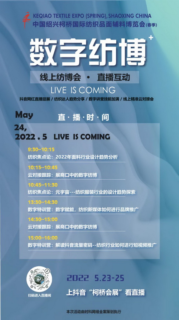 隨著紡織行業(yè)與數(shù)字經(jīng)濟的深度融合,近年來,產(chǎn)業(yè)正呈現(xiàn)更大范圍的要素整合與業(yè)態(tài)疊加,互聯(lián)、泛在、延展成為重要趨勢,并催生了一批新場景、新模式、新業(yè)態(tài),也讓企業(yè)收獲了更多的商機。本屆春季紡博會將進一步探索數(shù)字化辦展新模式,在努力辦好線下實體展會的基礎(chǔ)上,再次以“數(shù)字紡博”為主題開設線上活動,采用“以直播促展,以對接助展”的模式,通過主題探展+在線推介+專題講座的結(jié)合等形式,促進數(shù)字紡博品牌化進程的同時助力面料企業(yè)營銷數(shù)字化轉(zhuǎn)型。
