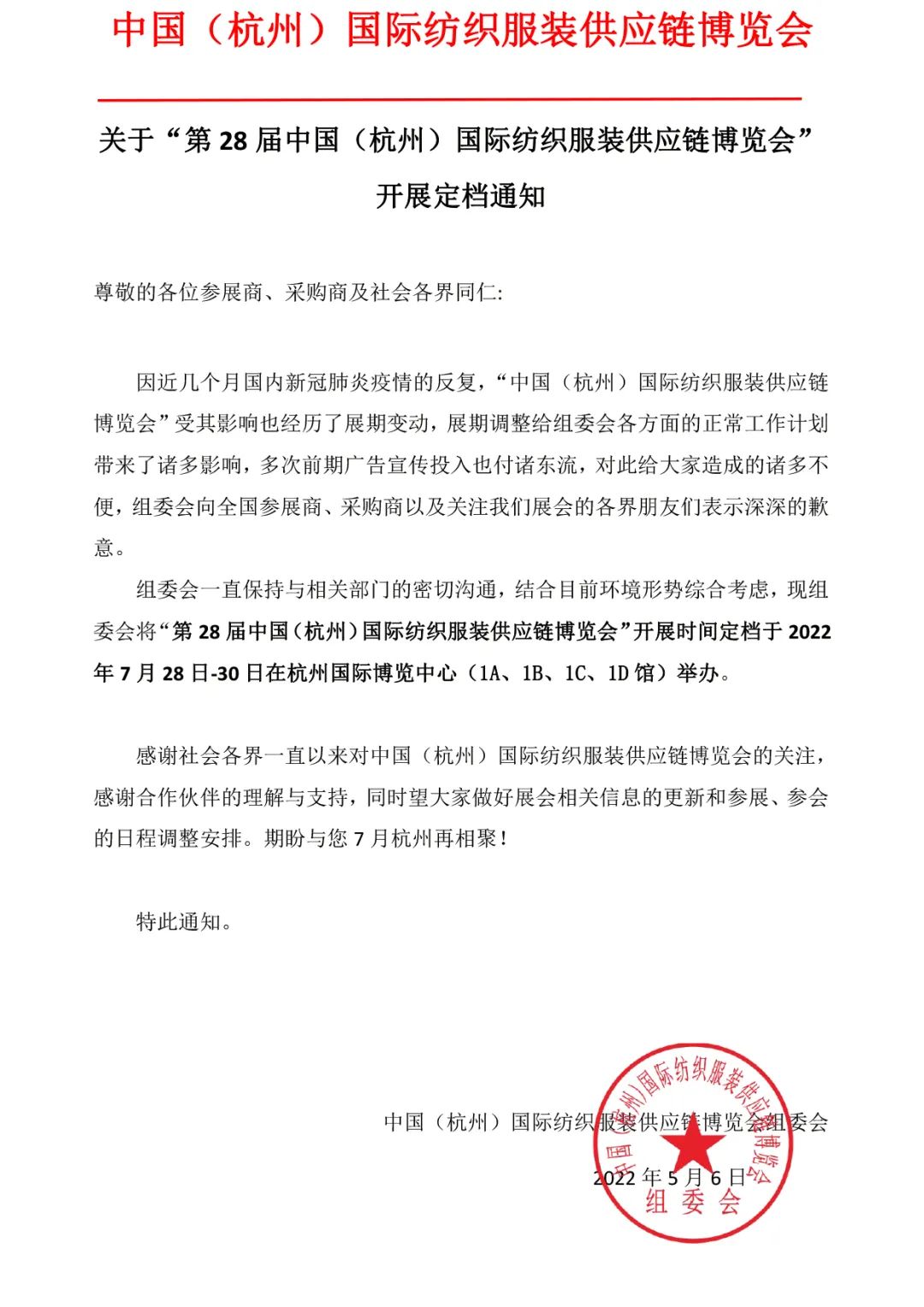 通知:中國(杭州)國際紡織服裝供應(yīng)鏈博覽會將于7月底舉辦