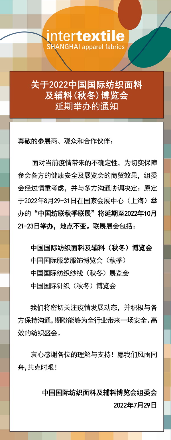 關于2022中國國際紡織面料及輔料(秋冬)博覽會延期舉辦的通知