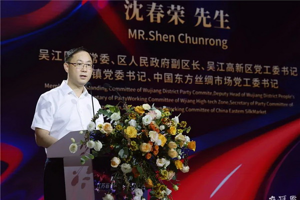 🔺吳江區委常委、副區長、吳江高新區黨工委書記、盛澤鎮黨委書記、中國東方絲綢市場黨工委書記沈春榮致辭。