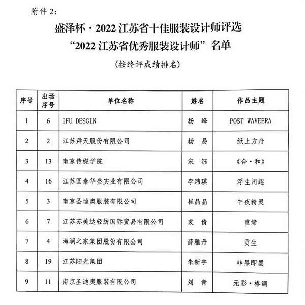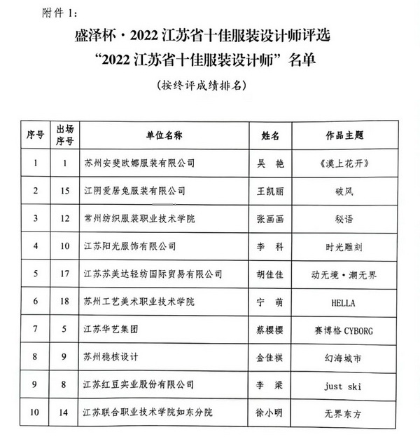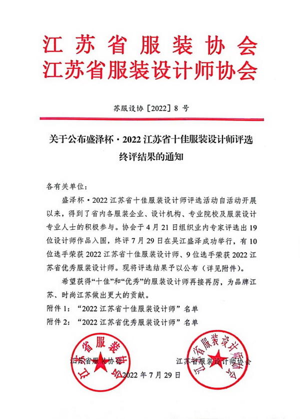 附件:關于公布盛澤杯.2022江蘇省十佳服裝設計師評選終評結果的通知