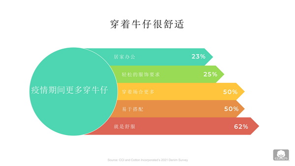 張立綱分析,疫情之后著裝風格的最大轉變之一是消費者偏好轉向更舒適、休閑且時尚的服裝。由于牛仔褲穿著舒適,人們居家辦公經常穿著牛仔,并且許多工作場所已經放寬或計劃放寬著裝要求,更助力消費者在工作場合穿著牛仔褲。而在工作之外的許多活動中,牛仔褲也是中國消費者的熱門選擇,五分之四的中國消費者表示牛仔褲是他們首選的休閑裝。