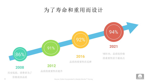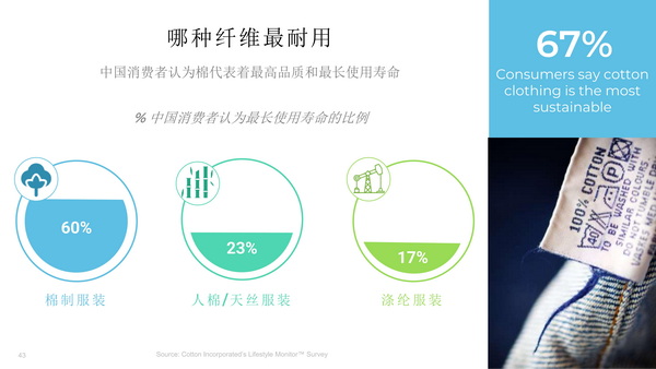 “推動服裝質量和耐用性將有助于延長循環經濟的使用和再使用階段。”張立綱表示,中國94%的消費者選擇質量而不是價格。消費者需要好質量,因此設計產品需要確保質量與耐用性。而中國近三分之二的消費者認為,與人造絲、滌綸等其他纖維相比,棉質服裝的使用壽命是最長與最可持續的。