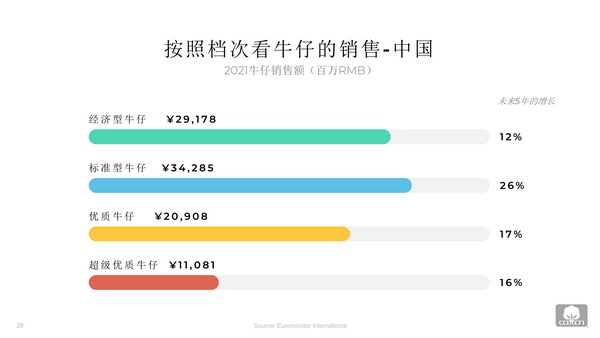 近一半的中國消費者表示,今年他們計劃購買比去年更多的牛仔褲。預計到2026年,牛仔褲的銷售額將強勁增長19%,達到近1130億元。張立綱指出,按牛仔褲種類來看,經濟型和標準型牛仔褲占中國牛仔褲銷售額的大部分,占市場的近66%。在未來五年中,中端價位標準牛仔褲的增長最快,緊隨其后的是高檔和超高檔牛仔褲。