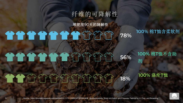 循環的最后一個支柱是可降解。近四分之三的中國消費者表示,服裝由可生物降解的材料制成很重要。Cotton Incorporated與北卡羅來納州立大學合作研究發現,在30天后,棉在廢水中降解了90%以上,在淡水中降解了80%,在鹽水中降解了接近50%,并且在所有這些環境中能夠完全降解。張立綱強調,作為植物和天然纖維,棉本質上是可循環的。