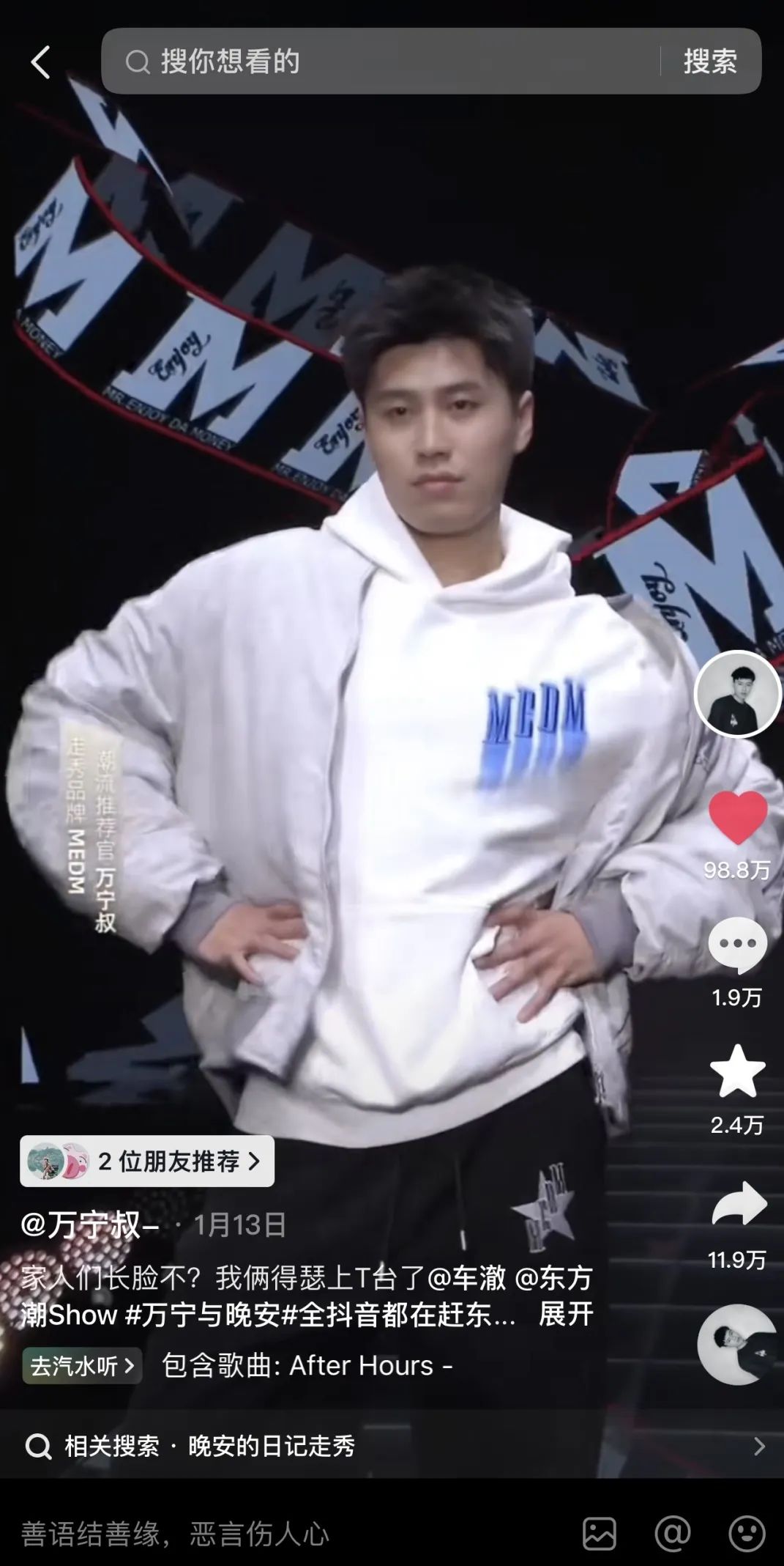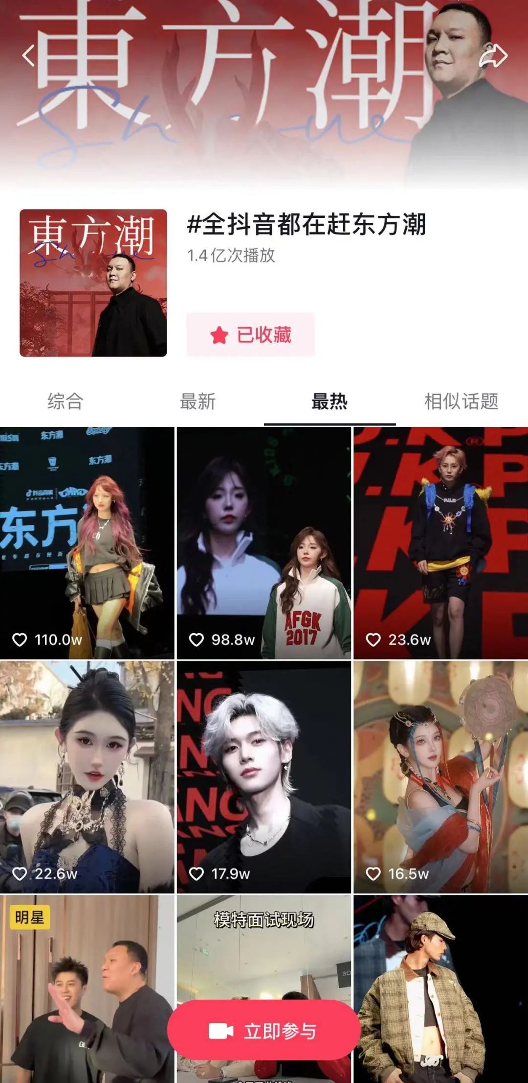 「一個品牌的傳播需要有一個支撐點的爆發」,這場“東方潮SHOW”直播盛典,既為品牌提供了爆發的支撐點、又助力品牌實現了知名度的提升。在直播當天,“東方潮SHOW”牢牢占據熱榜第一、全網榜第二,傳播聲量目前已經來到了1.3 億且還在不斷攀升;而在眾多登臺走秀的優質達人中,他們大多在個人賬號上進行了相關的內容創作,其中@好平靜的姐姐的單條視頻點贊量已經超過了110萬,@萬寧叔-的點贊量也達到90多萬。