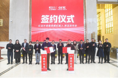 科技共生,未來已來。2月5日,紅豆集團旗下無錫福芯機器人有限公司與中國電子科技集團公司旗下中電科機器人有限公司在無錫正式簽約合作,并共同發(fā)布首款合作成果——輕量型髖關(guān)節(jié)助力外骨骼機器人。紅豆集團董事局主席周海江出席發(fā)布會并發(fā)言。中國電科第21研究所副總工程師、機器人研發(fā)中心主任王洪武,紅豆股份董事、無錫福芯機器人公司總經(jīng)理奚豐作為雙方代表進(jìn)行簽約。