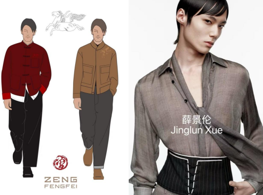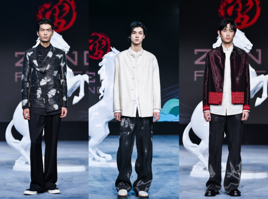 大秀開場,首套丙午系列高定男裝,由曾鳳飛品牌設計、定制,作品甄選桐昆絲絨面料,將丙午馬年元素與非遺割絨工藝相融,盡顯新中裝時代風骨。同時,特邀近幾季活躍在巴黎、米蘭國際時裝周的超模薛景倫開場演繹。設計師與超模以各自的藝術語言,完成了對纖維面料的時尚表達。