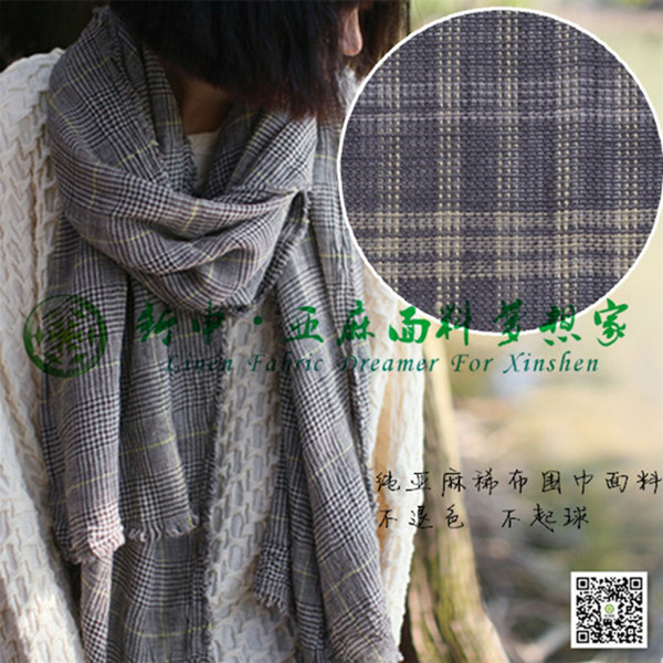 原創設計古樸格子純亞麻稀布毛邊圍巾面料