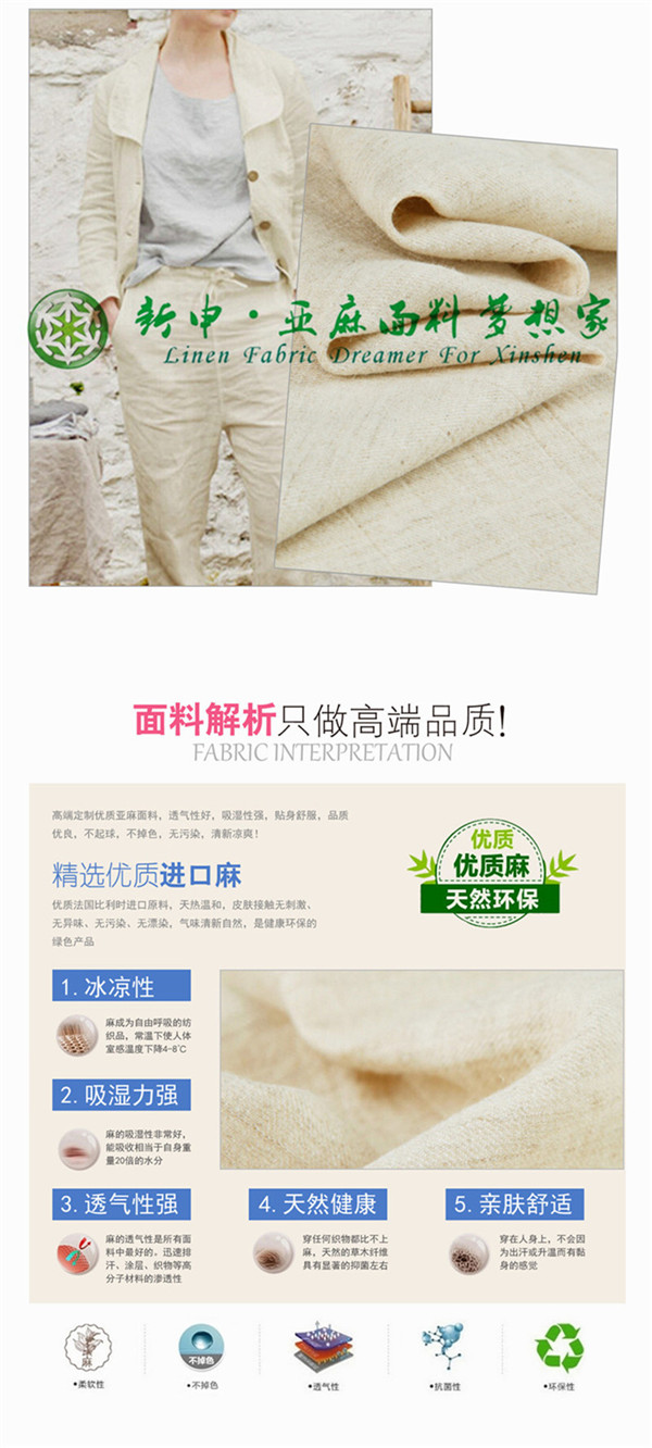 關鍵字:亞麻面料,優質舒適,涼爽親膚,寬松休閑,簡約大方