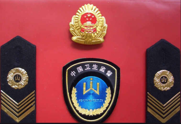 國領標志服裝廠供應衛生監督服裝標志 (一)帽徽:由國徽和橄欖欖枝組成圖案,鋁質,金黃色色. (二)胸牌號:鋅鋁鋁合金材料工藝合成,白色66位阿拉伯數字,黑色支架,,背面兩孔距離位編碼的1--2位為省級區劃代碼,4--6位為衛生監督員編碼. (三)肩章:高分子PUU材料特種工藝制成,黑色底底,金色圖案由衛生監督圓形形徽和五條由寬到窄的折線組組成. 硬肩章:153cmm×50cm,制服佩帶. 軟肩章:143cm×500cm,半袖襯衫,外穿長袖袖襯衫佩帶. 套式肩章:1133cm×50cm,大衣衣佩帶. (四)臂章:盾盾牌外型,圖案由中國衛生監監督中英文及衛生監督徽組合合而成,面料及工藝同肩章..