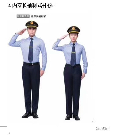 (一)制服:藏藍色,以江蘇陽光集團371001#為標準色,秋冬季厚面料,春夏季薄面料,單排扣西式套裝,式樣見附圖。 (二)半袖襯衫:白色軍港呢面料,以江蘇陽光集團cf01為標準色,式樣見附圖。