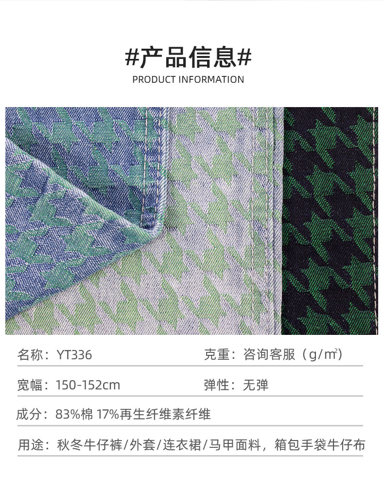 關鍵字:千鳥格,提花牛仔面料,賽絡紡,秋冬面料