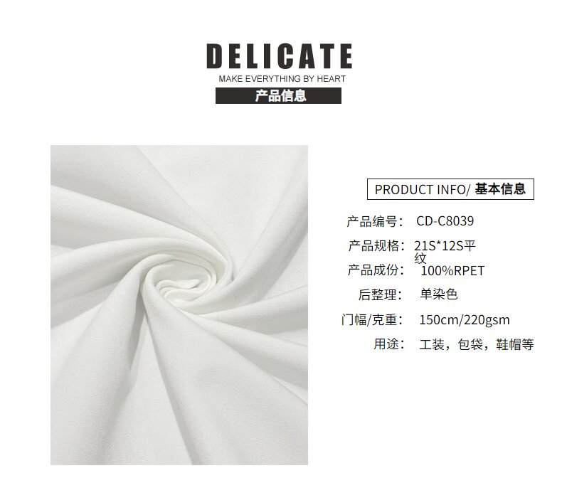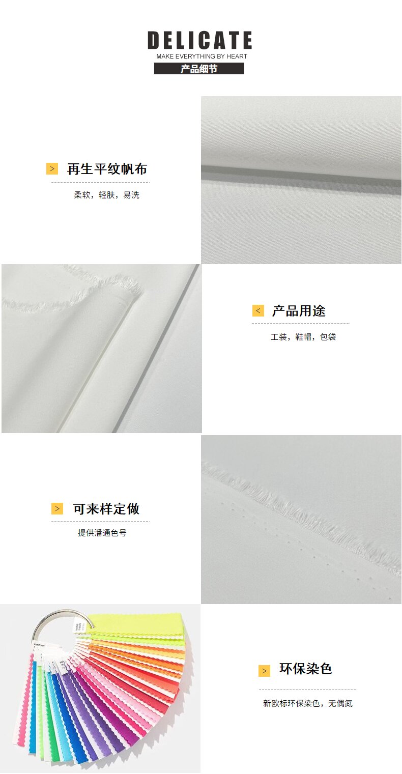 關(guān)鍵字:再生滌綸面料,平紋帆布面料,鞋帽面料,工裝面料