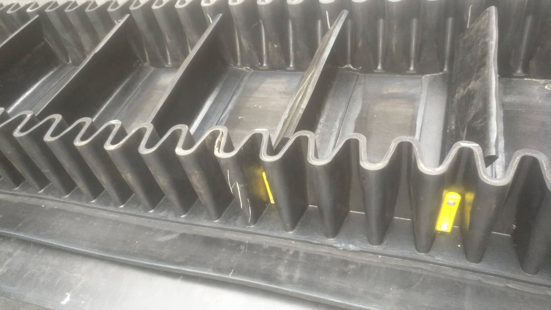 橡膠波狀運輸帶由基帶、波紋擋邊、橫隔板3部分組成。擋邊起防止物料測滑撒落的作用。為便于繞過滾筒,檔邊設計成波紋狀;橫隔板的作用是承托物料,為了實現大傾角輸送,采用T型TC型設計。檔邊和橫隔板是用二次硫化的方法與基帶連接的,具有很高的連接強度。
