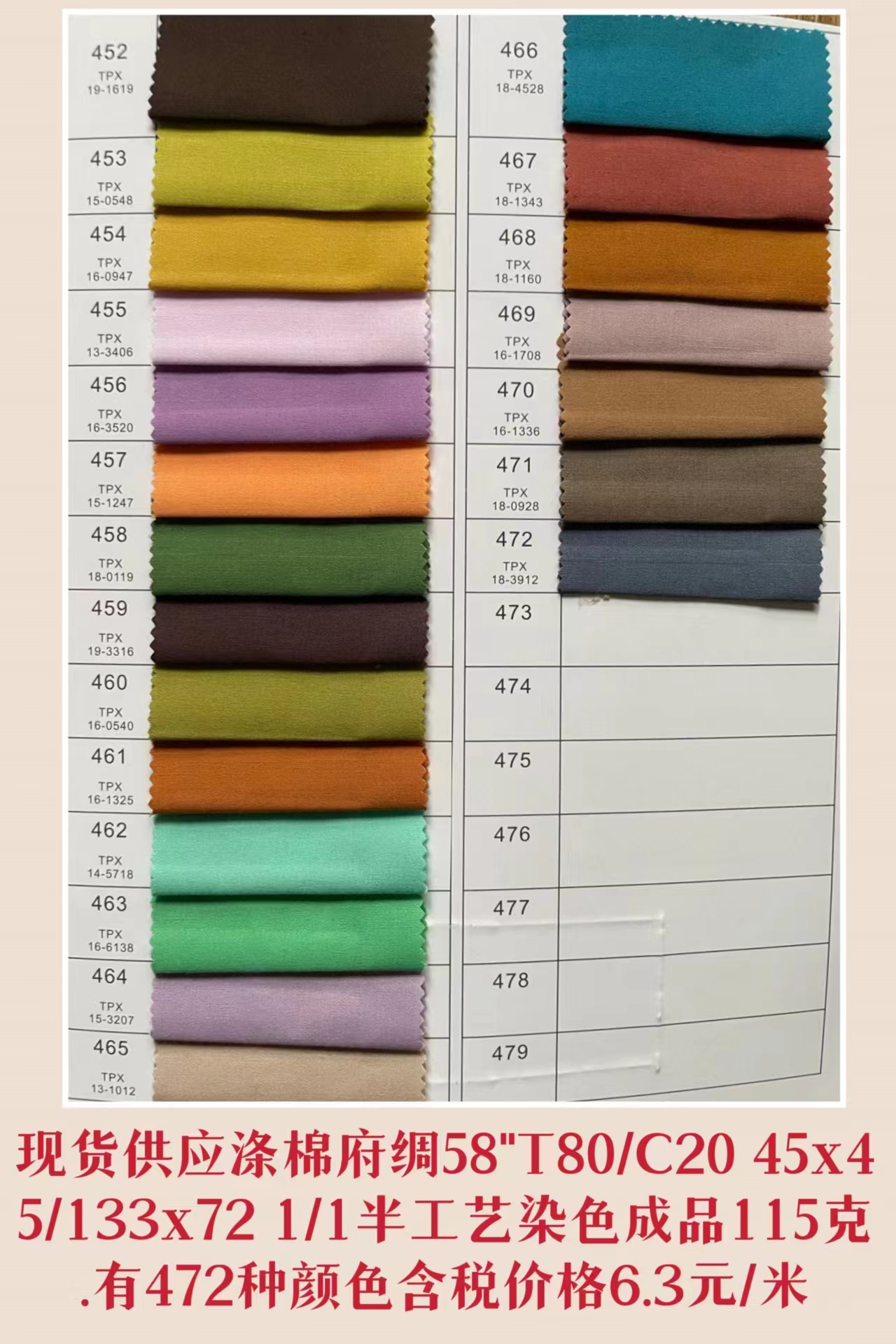 倉庫常年現(xiàn)貨供應60"T80/C20 45X45/133X72有472種顏色口袋布,