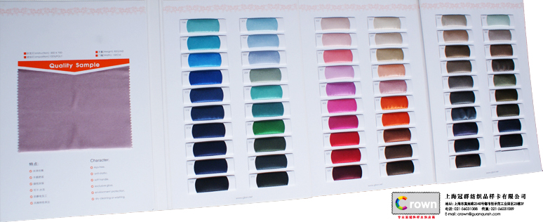 上海冠群紡織品樣卡有限公司專業生產,加工,設計,羊絨色卡,面料樣本,里布樣本,皮革樣本,壁紙樣本,輔料樣卡,紗線色卡,面料掛鉤,A4樣卡及紡織品實樣冊紡織品樣本的企業。我們服務的企業有面料企業,羊絨企業,里布企業,服裝輔料,紗線企業及家紡和家具企業等等。