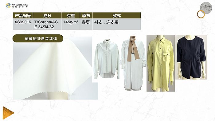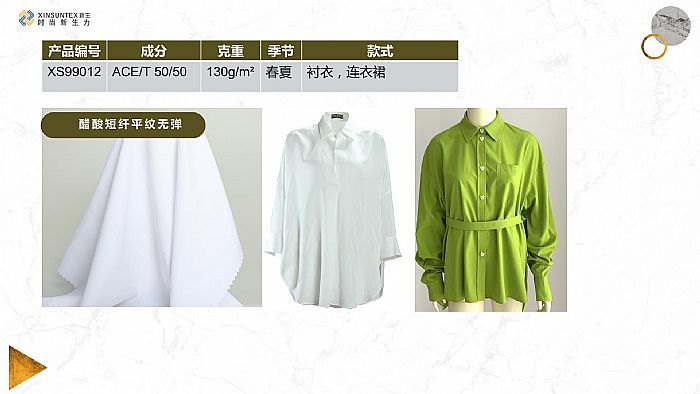 醋酸長絲與滌綸彈性絲交織,雙層組織,復(fù)合加捻工藝。織物吸濕透氣,不易起靜電,手感舒適干爽,面料挺括有垂感,可以做連衣裙,套裙等。對于此信息進行咨詢和留言