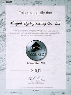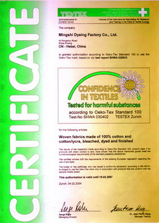 公司生產(chǎn)設(shè)備先進(jìn)、檢測(cè)儀器齊全。采用了DATACOLOR和GRETAGMACBETH測(cè)配色系統(tǒng)進(jìn)行生產(chǎn)監(jiān)控,通過(guò)人機(jī)對(duì)話實(shí)現(xiàn)顏色的量化管理,采用ITS多組檢測(cè)設(shè)備對(duì)產(chǎn)品進(jìn)行指標(biāo)檢驗(yàn),并獲得ITS實(shí)驗(yàn)認(rèn)證和檢驗(yàn)資格認(rèn)證。公司于是1997年率先在國(guó)內(nèi)印染行業(yè)通過(guò)ISO-9002質(zhì)量體系認(rèn)證,并于2002年2月通過(guò)Oeko-Tex Standard 100綠色環(huán)保認(rèn)證。