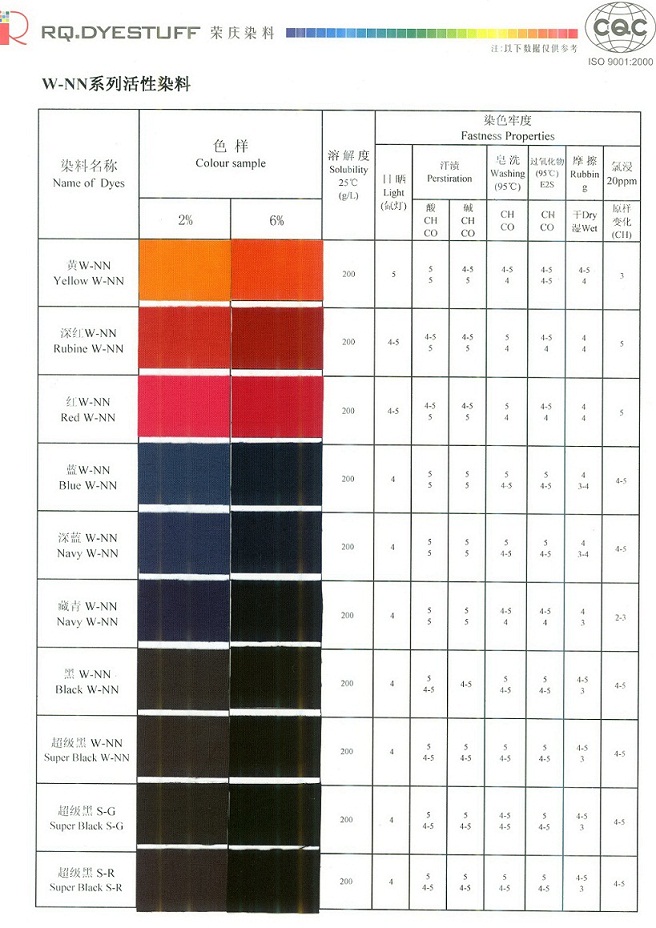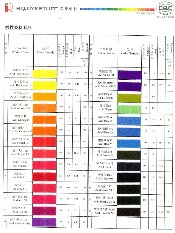 南海盈光染料有限公司是本地區首家專業直銷染料公司,可全面提供“榮慶牌”紡織、造紙、皮革、木材專用、金屬絡合溶劑、特殊用途等系列染料,品種多達800個,1000多個標準。廣泛使用于紡織業的棉、麻、毛、絲、滌綸、尼龍、粘膠等纖維,以及皮革、造紙、木材、鞋材、竹、工藝品、文化用品、油墨、涂料、日用品、塑膠、化肥、鋁材著色以及其它特殊行業。