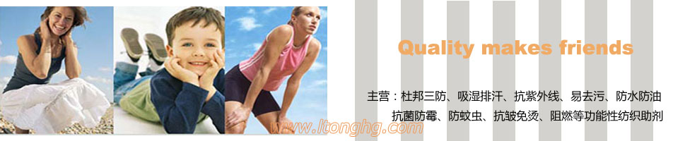 公司創建于2005年,自成立以來一直專業致力于高檔紡織品印染后功能性整理助劑的代理經銷,我們銷售的有美國杜邦、美國3M公司、科萊恩、亨斯邁(原瑞士汽巴精化)公司、日本大金公司、明成化學工業株式會社、魯道夫、巴斯夫等幾十個國際著名品牌。產品囊括了防靜電功能、免燙功能、耐久阻燃功能、超強抗紫外線UV功能、高效抗菌防臭功能、吸濕排汗功能、納米NANO三防(防水防油防污)功能,防塵功能、易去污功能、芳香功能、遠紅外線保暖保健功能、負離子光觸媒功能、防電子輻射功能等所有后功能性整理劑。公司擁有一批專業化、國際化、高素質的研發、銷售服務人員,并得到了中國紡織大學、紡織學院等高等學府的大力支持,技術力量雄厚。