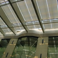 FSS天棚簾機構的機構主要是由1、卷管;2、管狀電機;3、彈簧機構,4、遮陽面料;5、面料牽引桿;6、卷繩器;7、牽引鋼絲繩 8、滑輪等組成。工作原理是利用電機作為動力,通過在一根卷管內的電機的轉動與另一卷管內的彈簧機構相互作用,通過牽引鋼繩,產生張力,使面料隨之開啟和閉合。當電機正轉時,克服彈簧阻力,將面料拉出;當電機反轉時,彈簧機構利用機構儲存的彈性勢能,將面料卷回,從而實現整套機構的開啟和閉合過程,選用合適扭矩的管狀電機,以適應工程的需要,使遮陽機構的利用率最優化。