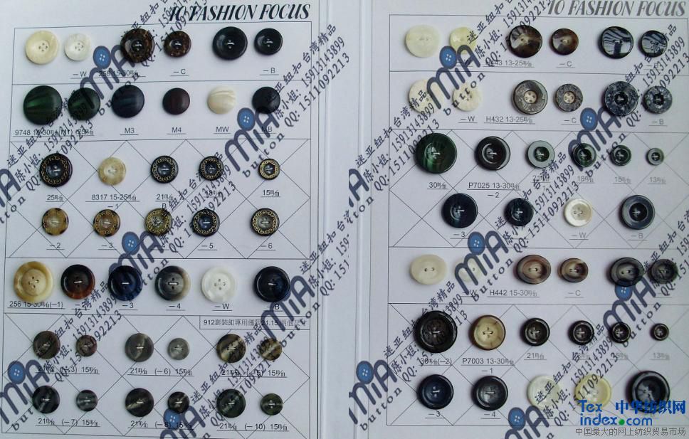 迷亞長年供應各系列紐扣, 主要產品有: 真牛角扣;樹脂扣;塑料紐;貝殼扣;果實扣;以及其他各種加工效果紐扣等.