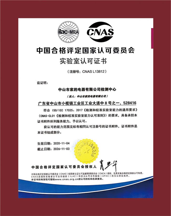 早在2020年,家的已經(jīng)獲得由CNAS 頒發(fā)的《實驗室認可證書》。雖然證書生效日期到2026年11月3日截止,但期間要進行2年一次的復(fù)評審。